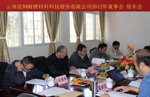 2012年3月24日,云南昆鋼耐磨材料科技股份有限公司首屆董事會第七次會議、股東會第五次會議在黑林鋪前街59號團鋼廠院內(原團鋼子弟小學)3樓會議室勝利召開。會議由董事長李亞鵬召集和主持,云南昆鋼重型裝備制造集團有限公司董事長兼總經理黃開萬、昆明新云欽耐磨材料總廠董事長馮煥欽、昆明理工大學材料科學與工程學院院長蔣業(yè)華等董事及云南昆鋼耐磨材料科技股份有限公司領導出席了會議。